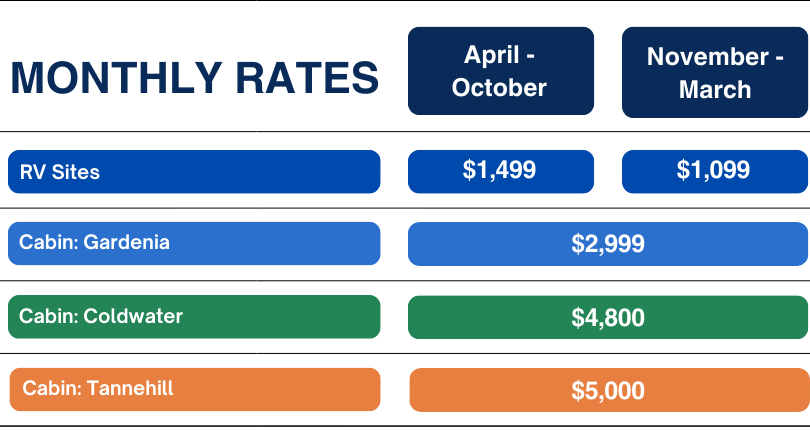 Carolina Camp Cedar RV Resort offers two seasonal rate periods. High Season runs from April 1st – October 31st, and Low Season spans November 1st – March 31st. Rates vary by lodging type weekday and weekend stays.